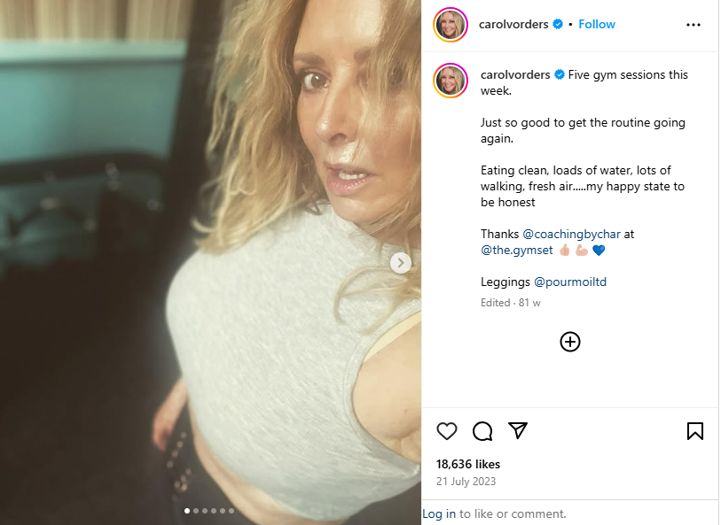 TV personality Carol Vorderman dedicates serious effort to keeping her incredible figure in top shape and recently posted striking photos that highlight her classic hourglass silhouette, with her form-fitting workout outfit perfectly accentuating her toned and confident rear.