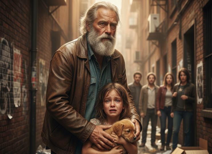 In a narrow alley of a quiet Western town, an aging biker drops to one knee to shelter a terrified little girl and her trembling puppy. What begins as one act of kindness soon uncovers wounds deep enough to hush an entire street.